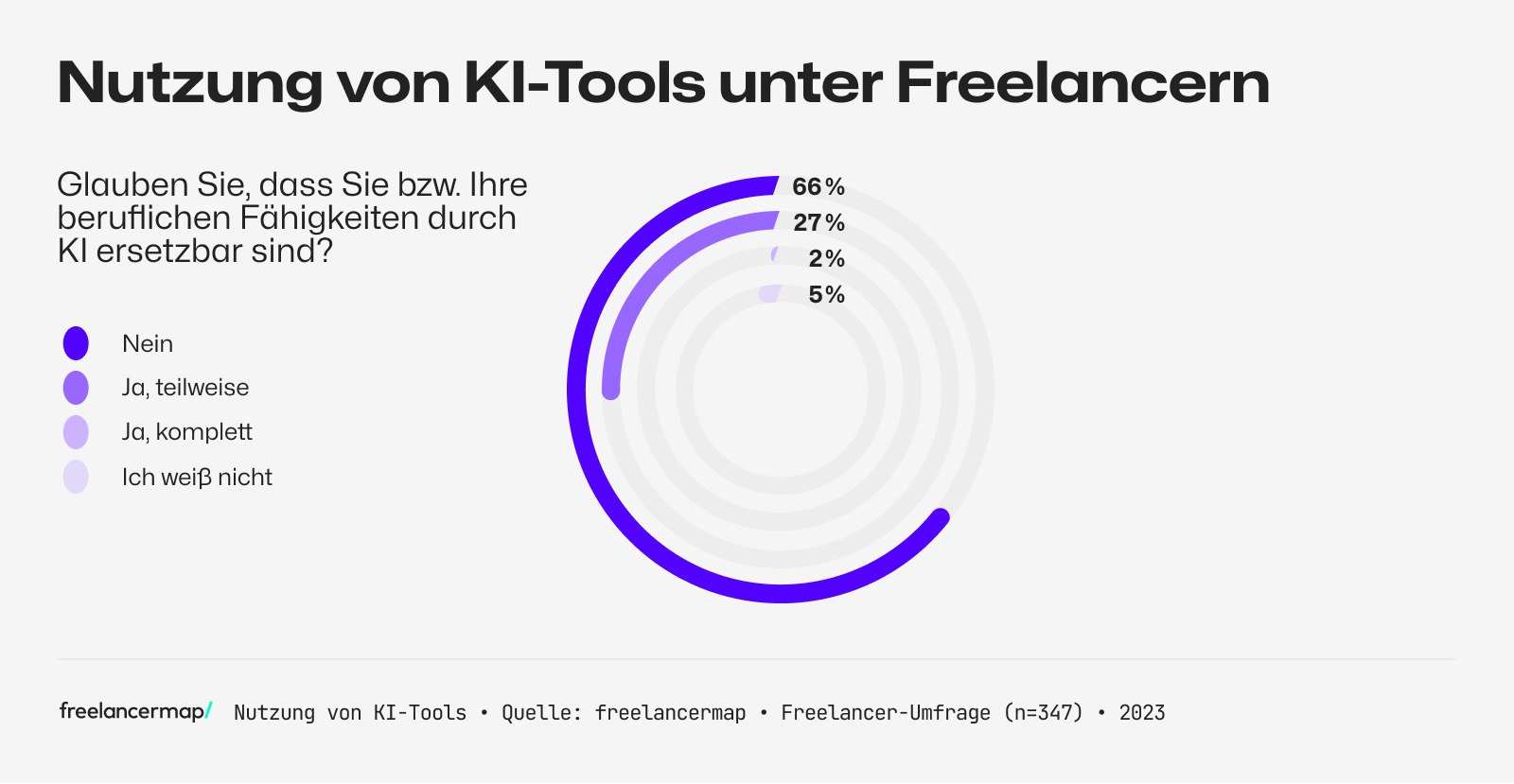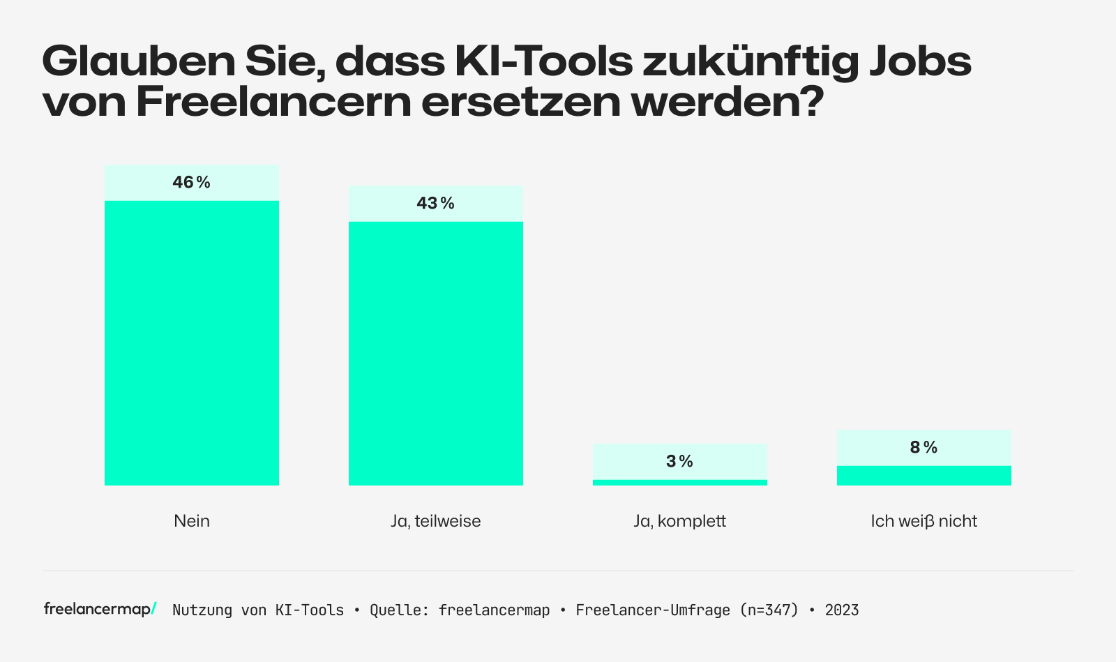 - Werden KI-Tools künftig Jobs von Freelancern ersetzen?: Unter den 347 befragten Freelancern glauben 46 Prozent nicht, dass KI-Tools ihre Jobs ersetzen werden. 43 Prozent rechnen zumindest teilweise mit einem Ersatz, 3 Prozent sogar komplett. 8 Prozent sind noch unentschlossen.