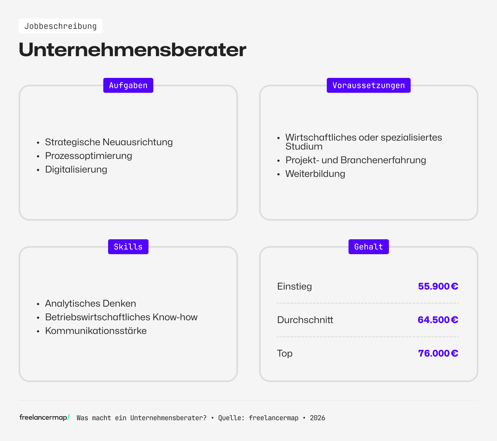 Das Einstiegsgehalt für einen Unternehmensberater liegt bei ungefähr 55.900 Euro brutto im Jahr. Das Durchschnittsgehalt bewegt sich um die 65.000 Euro brutto jährlich. Das Senior Gehalt befindet sich durchschnittlich bei 76.000 Euro und mehr.