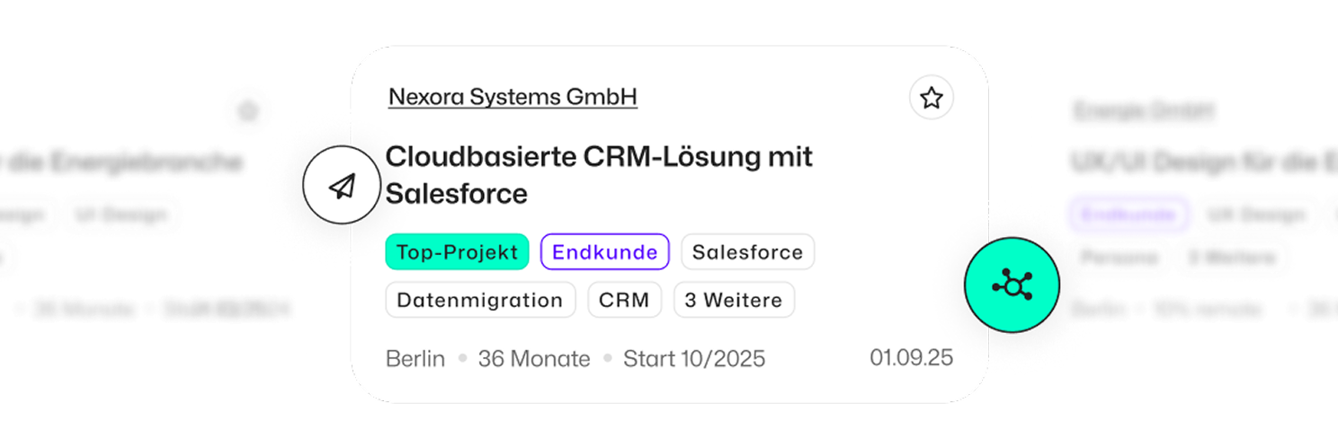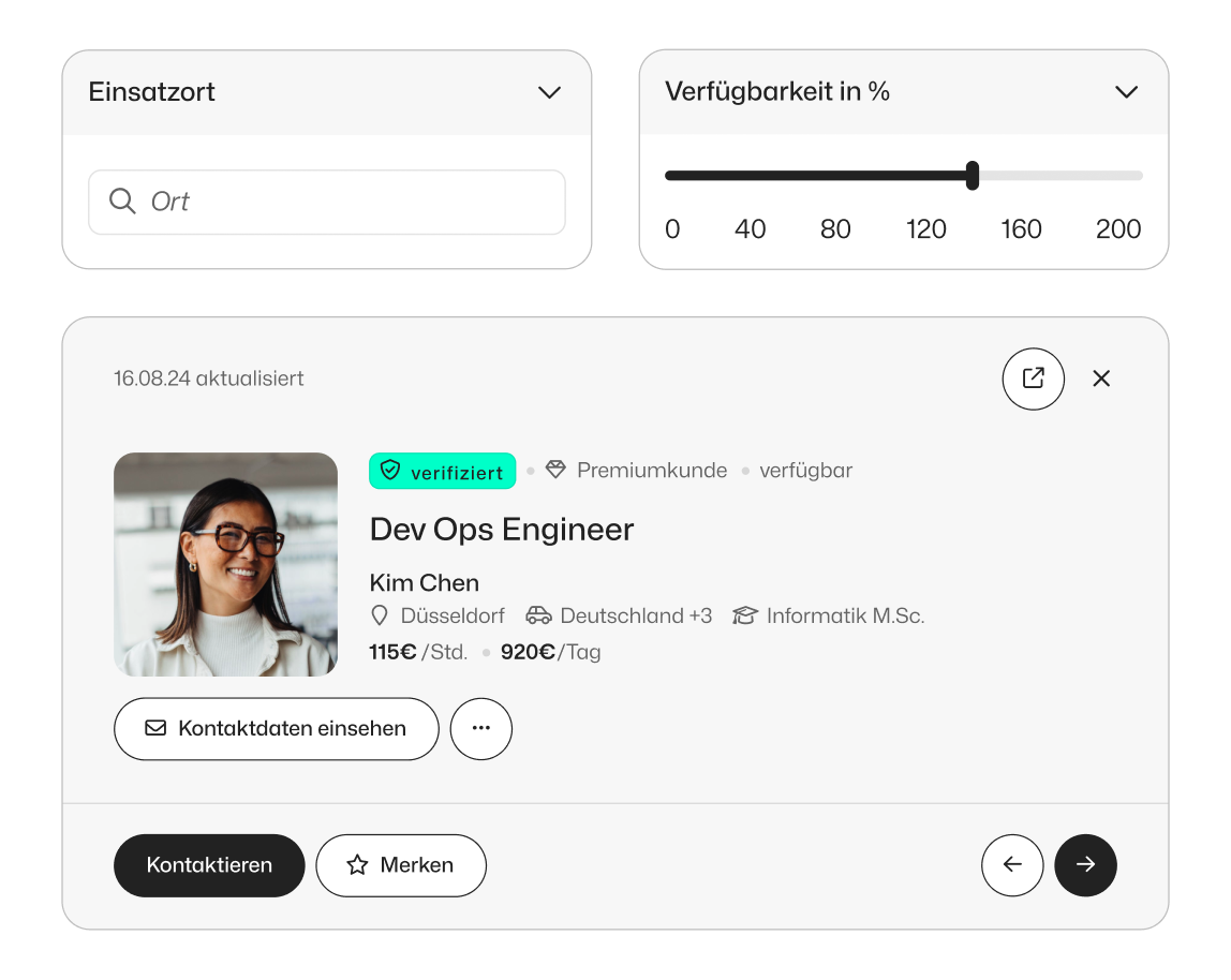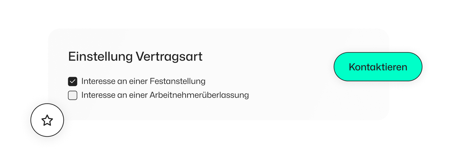 In Ihrem Account können Sie ab sofort angeben, ob Sie auch für Projekte in Arbeitnehmerüberlassung oder Festanstellung kontaktiert werden möchten. So erhalten Sie nur passende Anfragen – ganz nach Ihren Präferenzen.