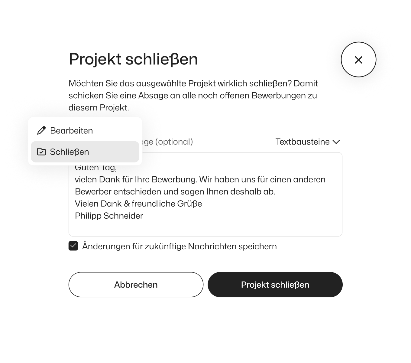 Sie haben jemanden für Ihr Projekt gefunden? Herzlichen Glückwunsch! Nun können Sie das Projekt schließen. Offene Konversationen erhalten automatisch eine Absage. So geben Sie den Bewerbern Feedback, vermeiden Rückfragen und halten Ihr Postfach aufgeräumt – mit nur einem Klick!