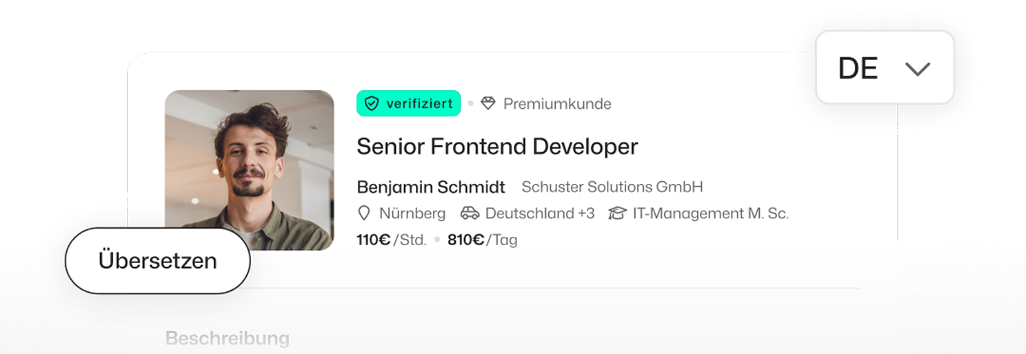 Dieses Freitextfeld wurde entfernt, um eine klarere Struktur im Profil zu schaffen. Angaben aus diesem Bereich sollten in den Skill-Bereich überführt werden, da nur dort erfasste Informationen ins Matching einfließen. - Automatische Profilübersetzungen